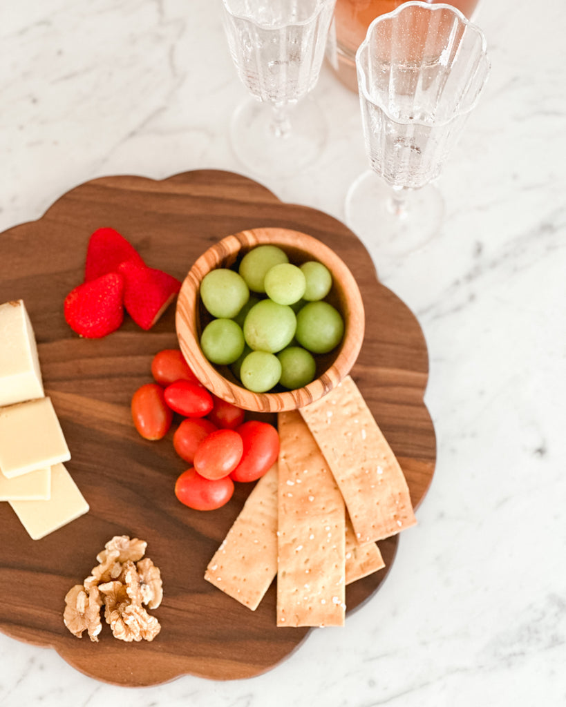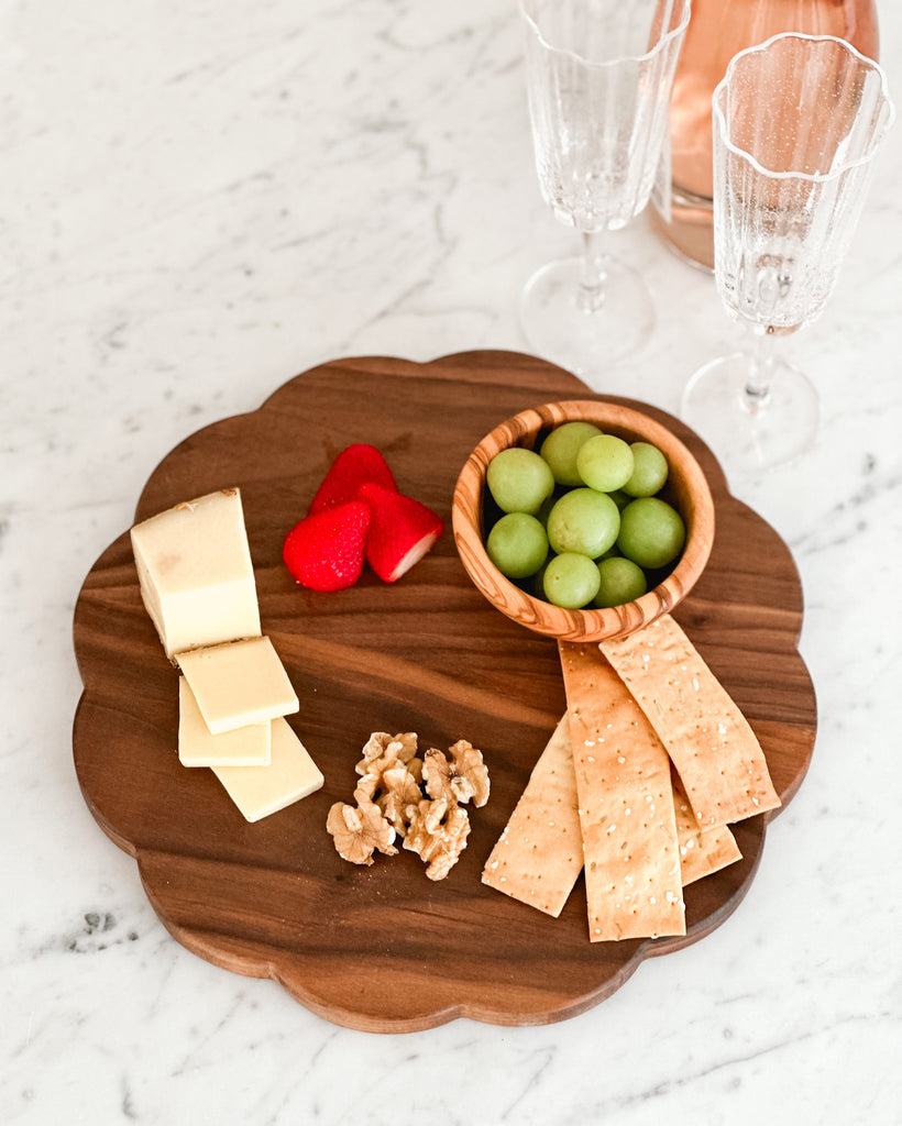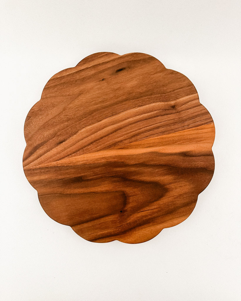 Our exclusive Round Scalloped Board is meticulously handcrafted from rich walnut wood. Its distinctive scalloped edge detailing adds an elegant touch of charm to your plating, making every dish look like a work of art. This versatile board is perfect for any occasion, from sophisticated dinner parties to casual family meals. Use it to serve cheese, charcuterie, appetizers, or as a stylish cutting surface.