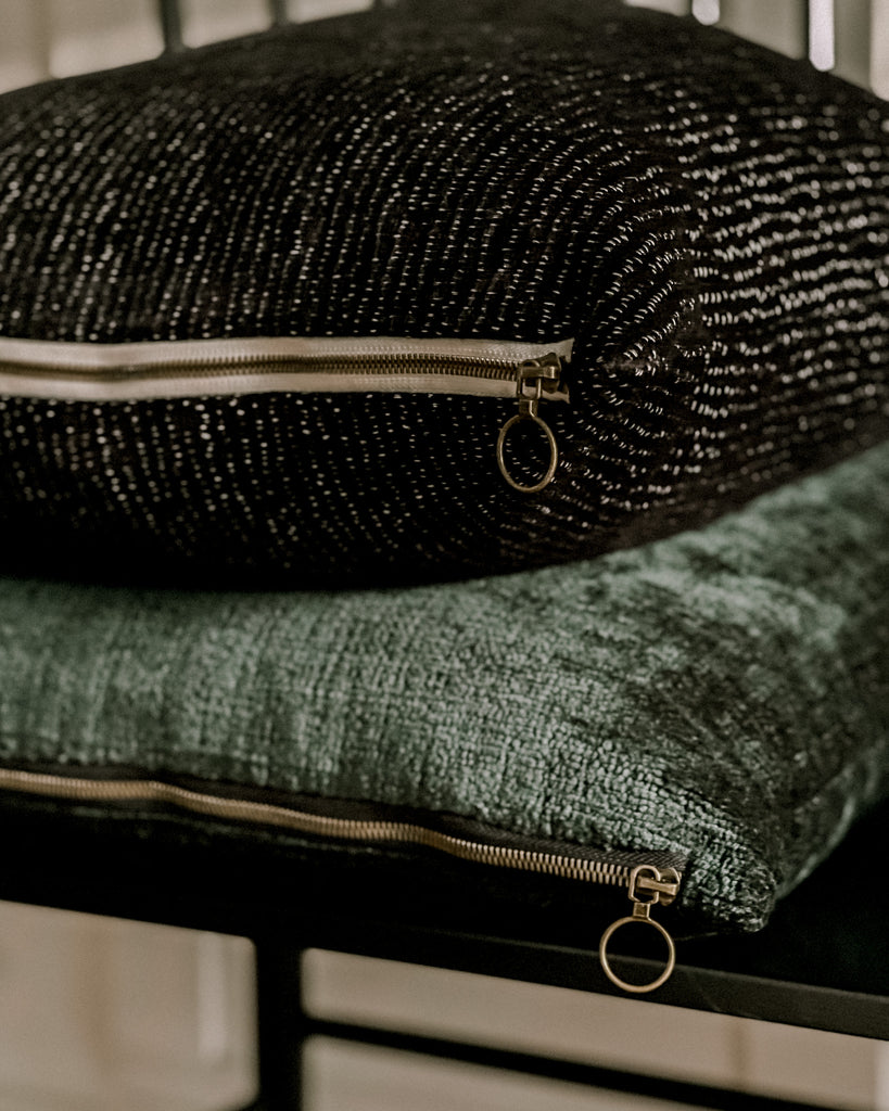 Constructed from a heavy velvet upholstery grade fabric with a custom Industrial brass ring zipper closure. This rich velvety fabric will add texture and warmth to any room in your home this holiday season and all winter long.