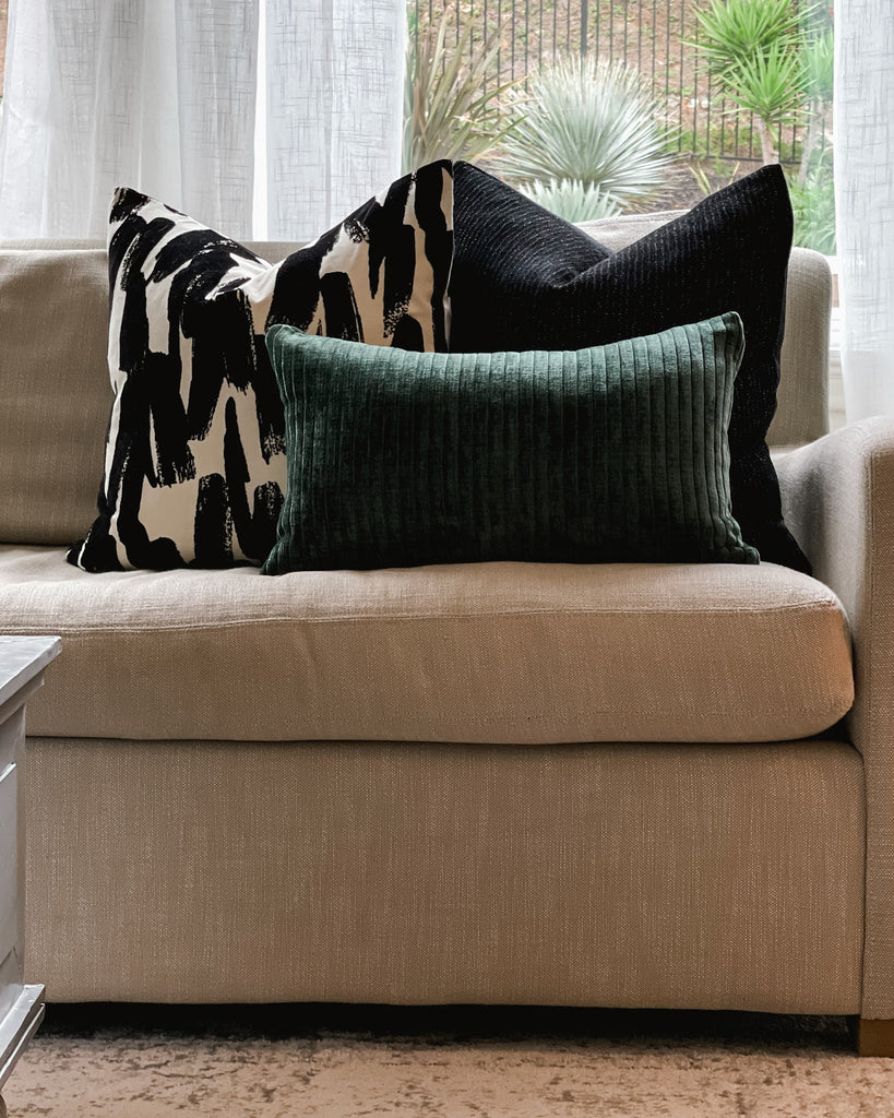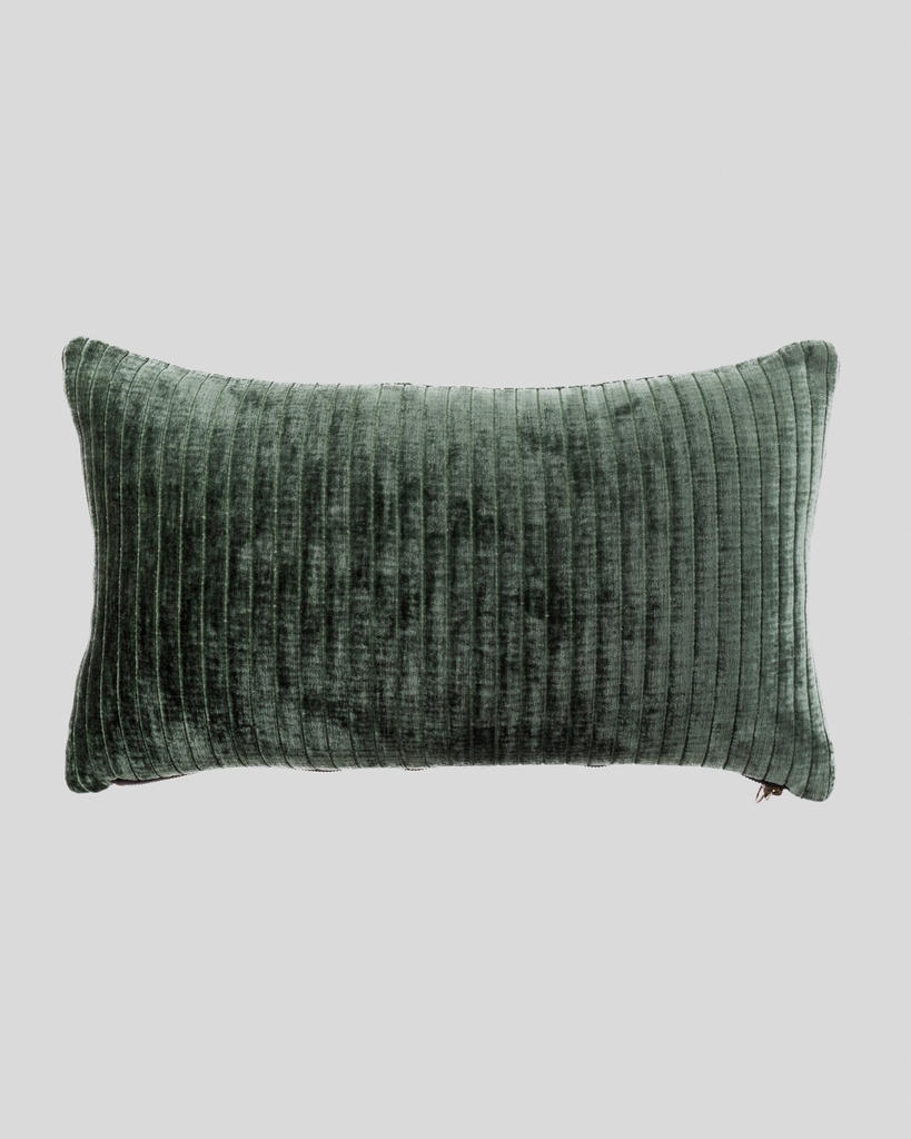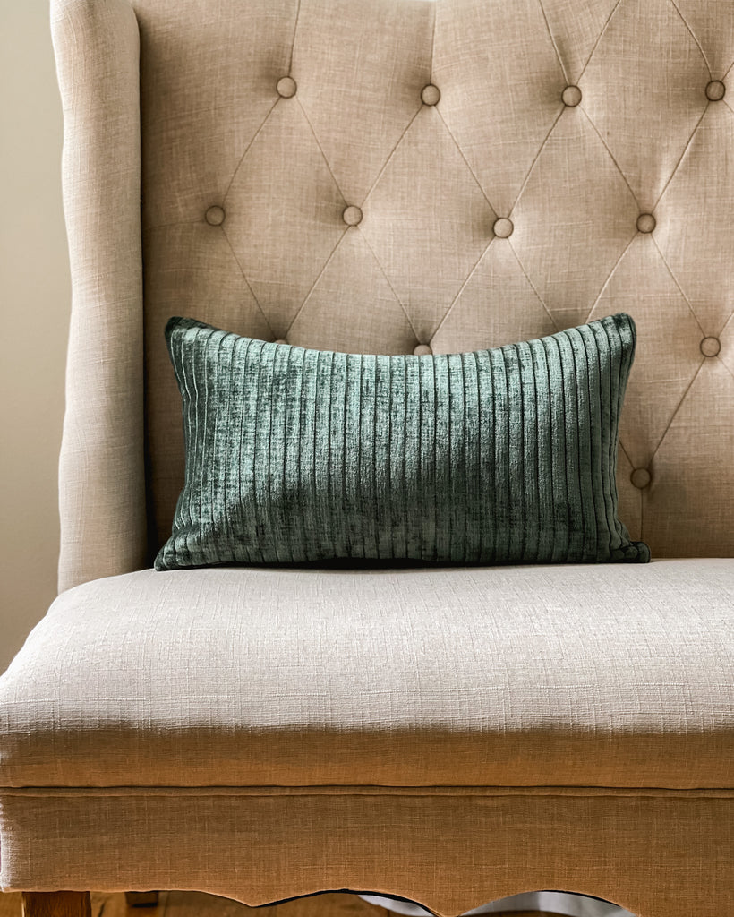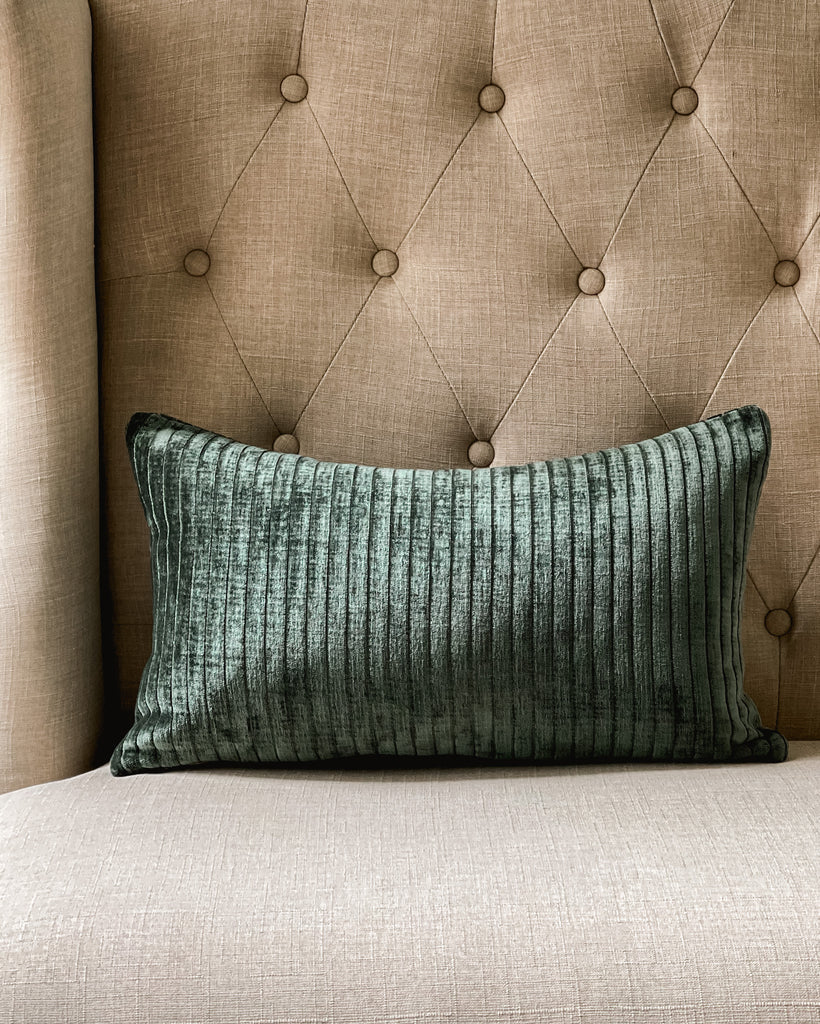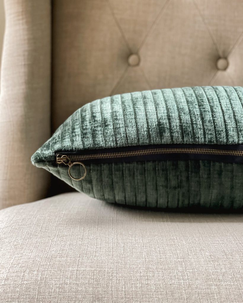 Our new Jaymes Lumbar Pillow is constructed from soft yet dense upholstery grade velvet fabric with a custom industrial brass ring zipper closure. This velvet ribbed fabric will add texture and warmth to any room in your home this holiday season and all winter long.