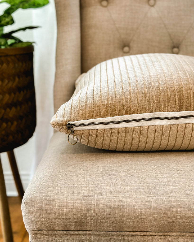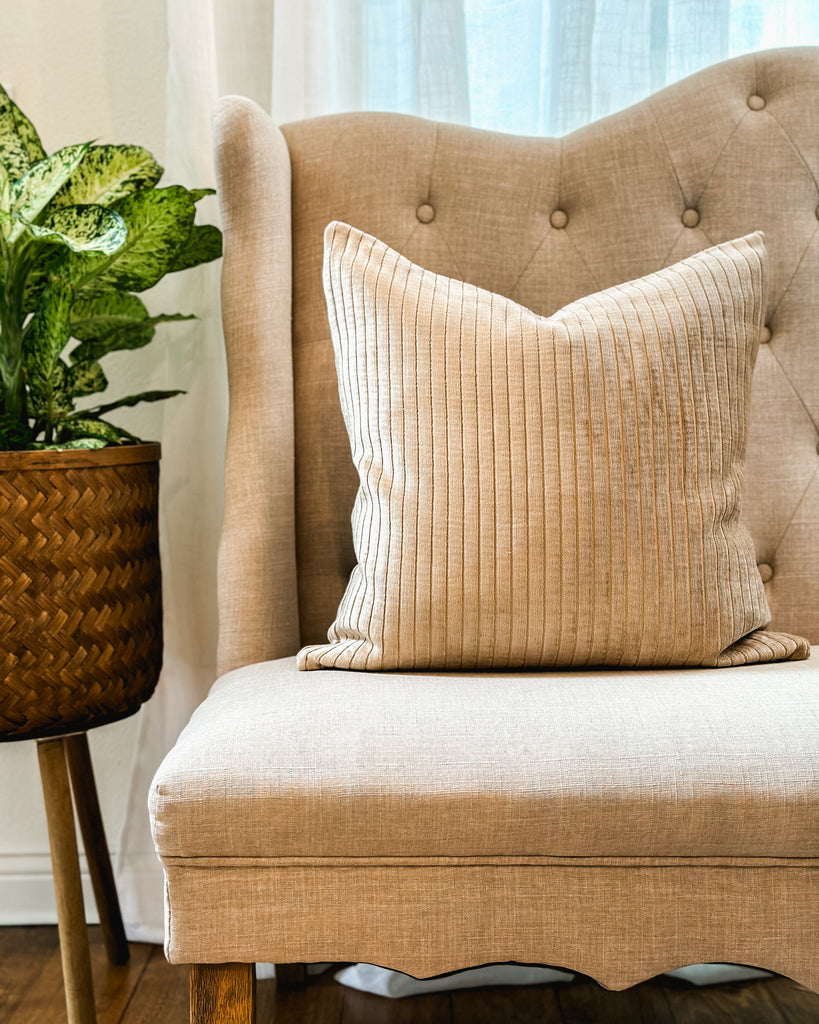 The Jaymes Pillow {Tan} is perfect accent for any home color palette. This plush velvet pillow boasts a luxuriously soft texture and long-lasting durability. The unique texture and color make it the perfect accent piece to brighten up your space.
