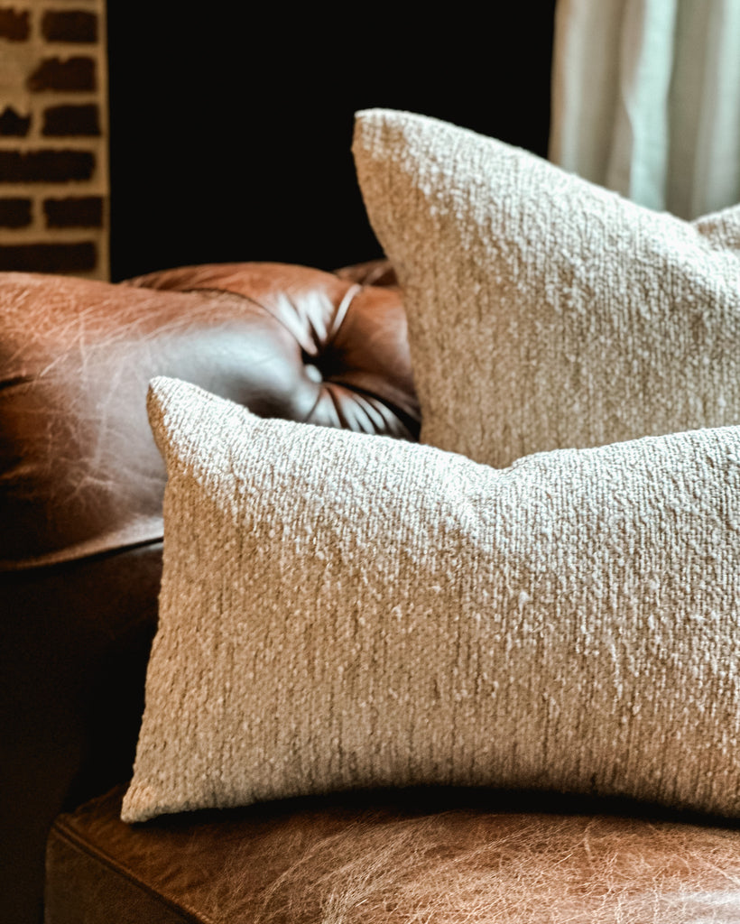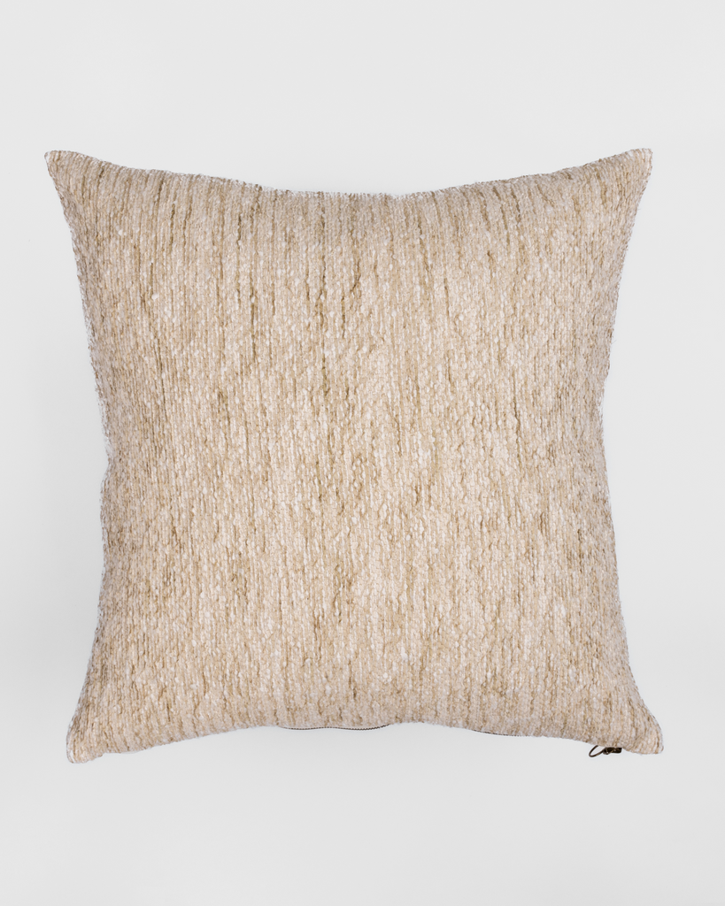 Constructed from a boucle upholstery grade fabric, this pillow has luxe ribbons of ivory, gold and tan knotted together to create a gorgeous texture across the pillow cover. A perfect neutral pillow to bring together various colored and patterned pillows in your home.