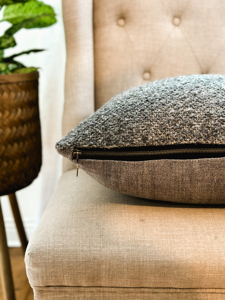 Constructed from not one but TWO durable upholstery grade fabric with a custom industrial brass ring zipper closure. This traditional boucle + linen fabric pillow will add texture and warmth to any room in your home and compliment any of our other new pillow designs.